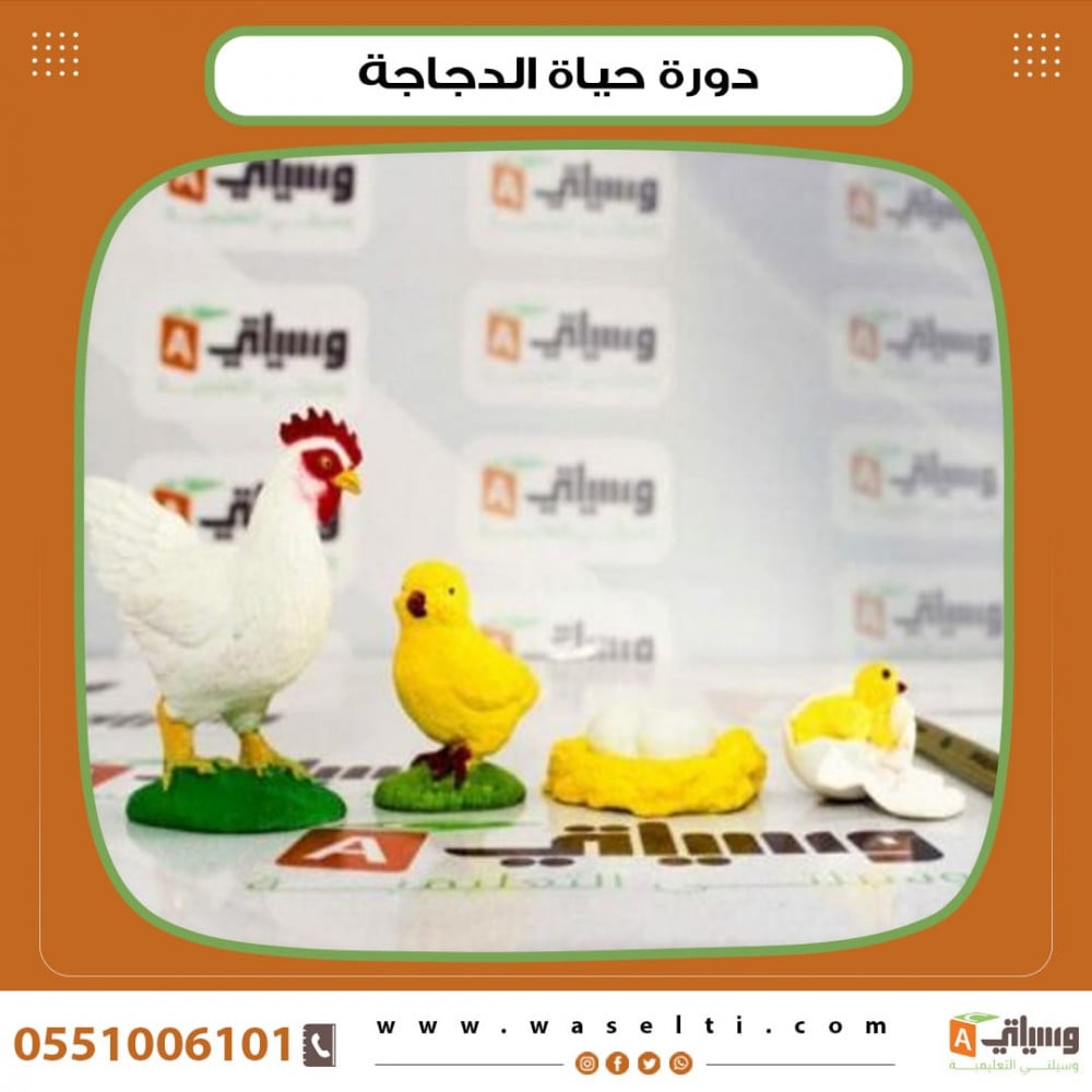 مجسمات مصنوعة من البلاستيك بشكل جذاب توضح فيه دورة حياة الدجاجة مما يسهل على المعلم توصيل المعلومة بشكل صحيح للطلاب في هيئة وسيلة تعليمية